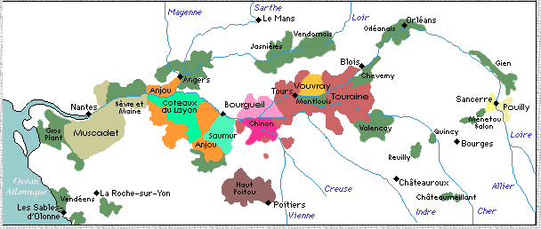 The Loire Valley, a very beautiful area which is famous for its white wines. About 75 percent of the wine production of this area is in whites. The region is wide and follows the river beginning in Auvergne and Massif Central and ends at the Atlantic Coast near Nantes. In actuality, the Loire Valley region is made up of several different regions which have the wide and deep Loire River in common. Chenin Blanc or Sauvignon are the most widely used varietal of this region. Vines were already being cultivated in this area when the Romans invaded. On the banks of the river grapes for white wine are grown. Further up on the hills grow the reds.