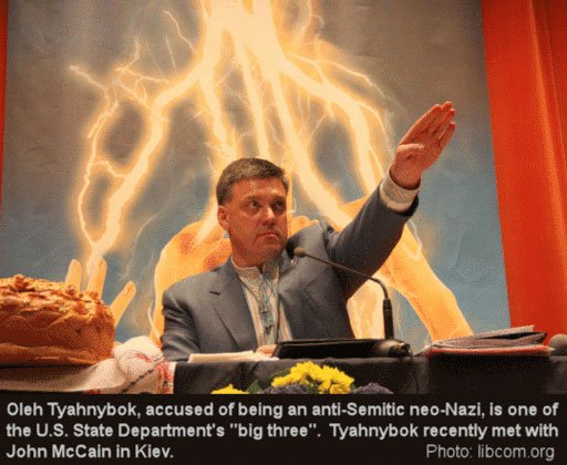 Putin’s entirely justifiable move to come to the rescue of ethnic Russians in Crimea who have been threatened and even killed in Kyiv by neo-Nazi thugs — thugs whom McCain has himself actively supported and met with (see right) — is billed as a bid “to restore the Russian Empire.”