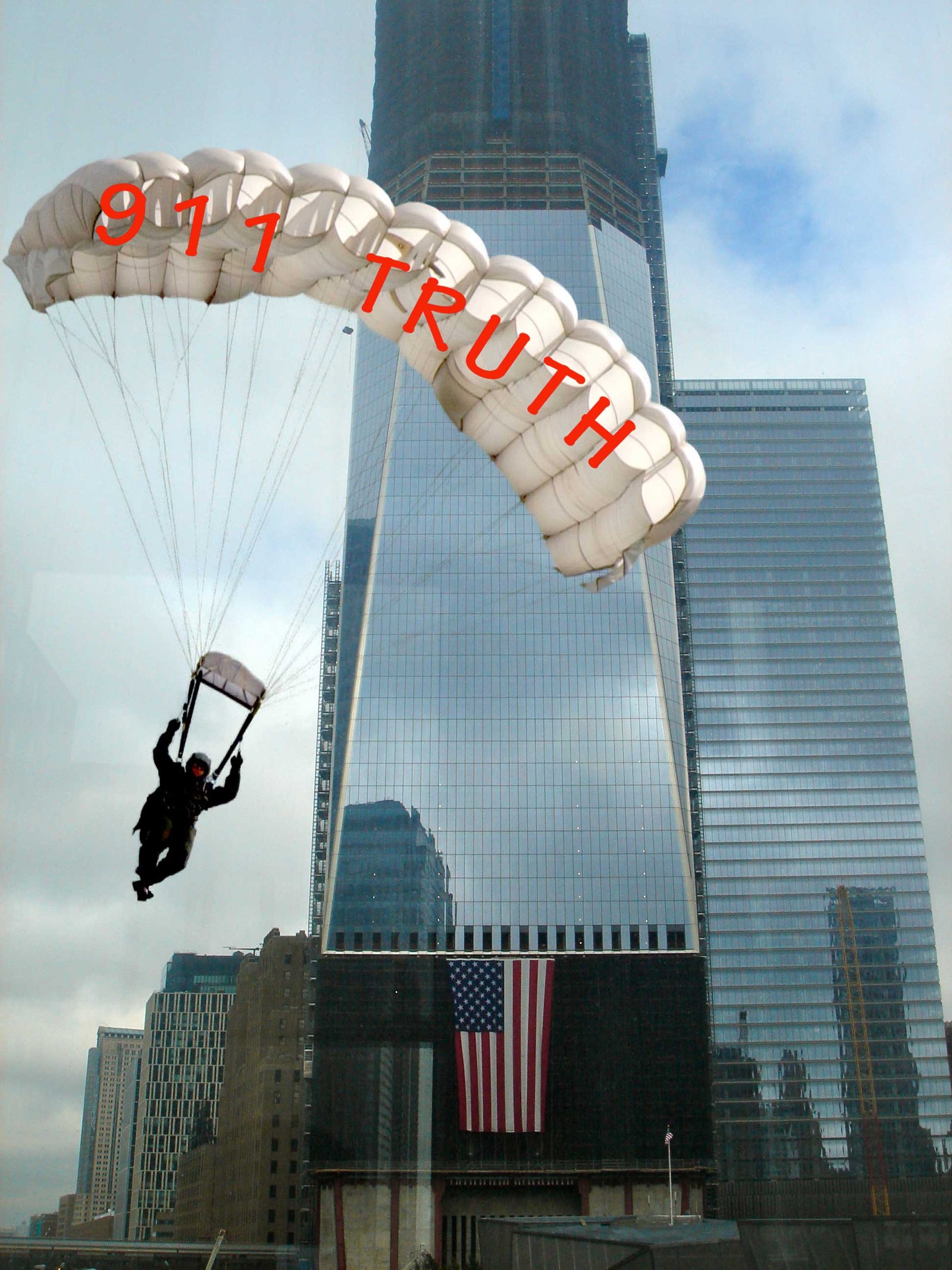 In an apparent protest against the Orwellian police state unleashed by the 9/11 inside job, four patriotic paratroopers decided to “chute Larry Silverstein” – by jumping off the top of the Unfreedom Tower.