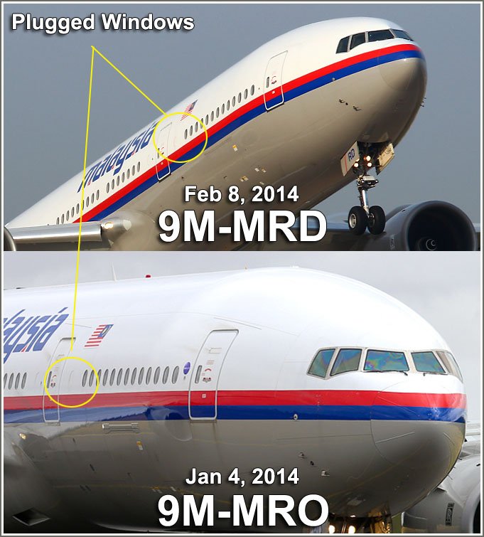 In order to pursue the theory that the aircraft was salted with cadavers, it makes little difference which plane was involved. We know that 9M-MRD was out of service for the flight MH-17 for a complete month prior to the crash, allowing possible opportunity for “modifications” in preparation for a staged event using fly-by-wire technology available in the B-777 aircraft. So far, the evidence for the window plug is verification that either aircraft could have been modified for use. (See EXHIBIT G)