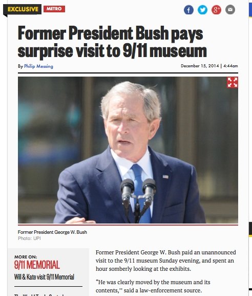 And speaking of business opportunities, New York City’s 9/11 museum, that Shrine of the Monstrous Lie, just missed its big chance to grab some publicity and increase revenues. The occasion presented itself when 9/11 criminal, traitor, and unelected non-president George W. Bush took a break from sending naked self-portraits to his sister and wandered onto the grounds.