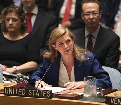 Dear Ms. Power, how many Palestinian resolutions have you been the only hand raised against, to “compound the atrocities against the Palestinian people”? Methinks you doth protest too much, madam. Not one of these foreign ministers has had a harsh word to say about Kiev stonewalling the investigation, the only proven obstruction of justice in the case that we have so far.